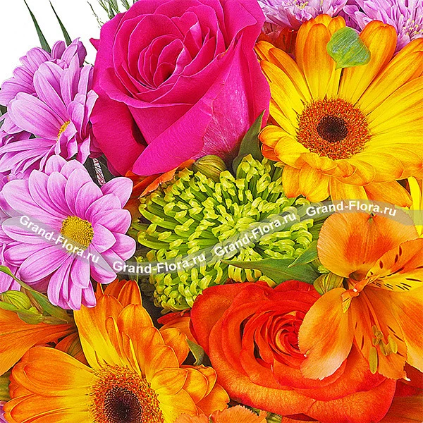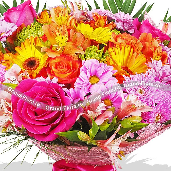 Стандартный (на фото): хризантема ромашковая фиолетовая - 7 шт, гербера оранжевая - 3 шт, гербера желтая - 2 шт, роза розовая - 3 шт, роза оранжевая - 3 шт, альстромерия оранжевая - 3 шт, альстромерия розовая - 5 шт, хризантема одноголовая зеленая - 3 шт, лист рабелини - 3 шт, натуральная упаковка розовая, бант в тон, + коробка конфет в подарок.